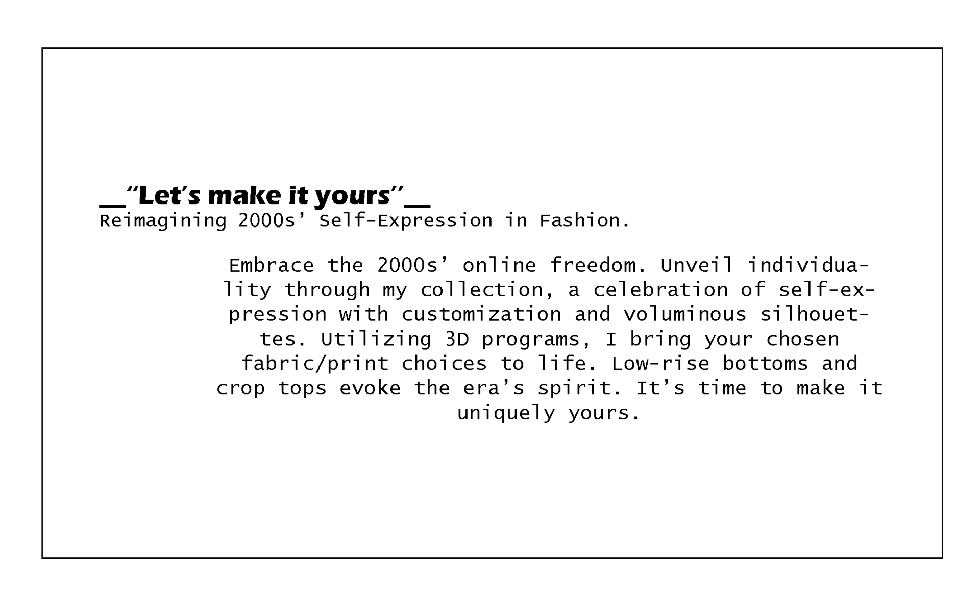 During my minor in 3D Hypercraft, I learned how to create a 3D version of physical garments using digital programs such as Clo3D, Substance Painter and Blender.