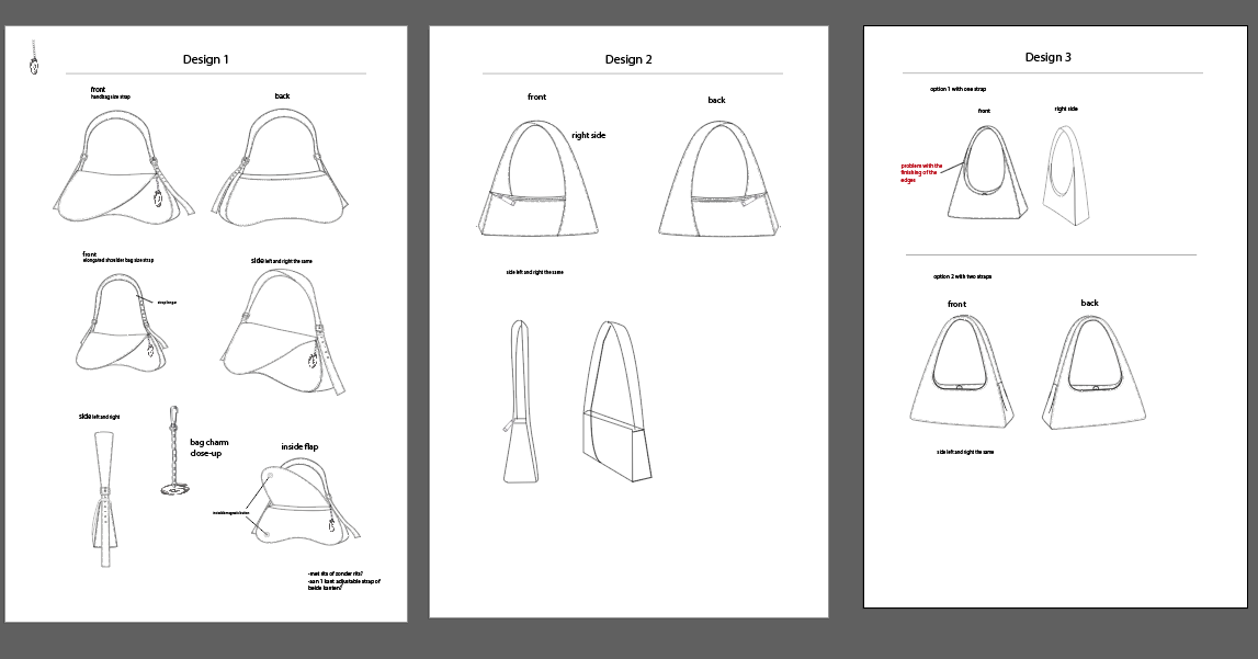 In the design phase, I created technical drawings to showcase different sides of the bag design and ensure that every detail was accurately represented for production.